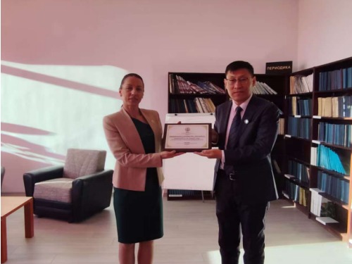 副校长张民向校长伊万诺娃赠送taptap点点纪念牌匾