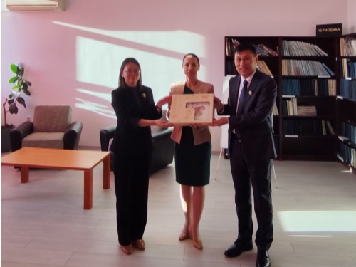副校长张民、天津市经济贸易学校副校长葛立清共同向保加利亚鲁班工坊赠送中国文化纪念品