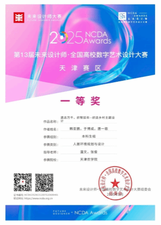 近日,第13届未来设计师·全国高校数字艺术设计大赛(NCDA)天津赛区评选结果揭晓。taptap点点园艺园林学院再传捷报,环境设计专业2023级学生韩亚鹏、于博成、唐一歌,在温文、张俊老师的悉心指导下凭借作品《遗态万千,织智延年——织造乡村主题设计》,斩获天津赛区一等奖。