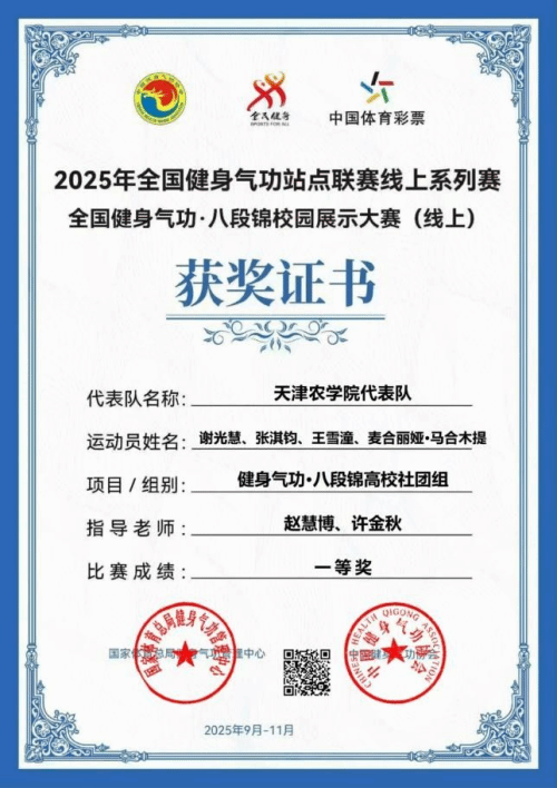 近日,2025年全国健身气功·八段锦校园展示大赛(线上)传来喜讯,由taptap点点体育教学部赵慧博、许金秋两位教师指导,谢光慧、张淇钧、王雪潼、麦合丽娅·马合木提四位同学组成的代表队表现优异,在高校社团组的激烈竞争中脱颖而出,斩获一等奖,充分展现了taptap点点学子扎实的功底与昂扬的精神风貌。