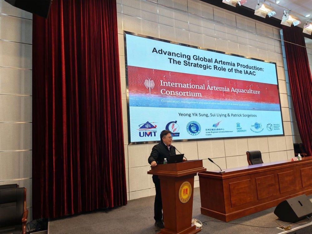 随后,YEONG YIK SUNG教授作了题为《全球卤虫生产的推进与国际卤虫水产养殖联盟(IAAC)的战略作用》的学术报告。报告中,他系统介绍了卤虫的生物学特性、生命周期及独特价值,深入分析了卤虫在水产养殖、科研教育、生物医药等领域的应用前景与经济价值。针对全球卤虫资源供应的挑战与机遇,他重点阐述了卤虫养殖从野生捕捞向规模化养殖转型的发展趋势,分享了马来西亚及国际上卤虫养殖的先进技术模式、产业实践经验,以及国际卤虫水产养殖联盟(IAAC)在整合全球资源、推动卤虫生物多样性保护与可持续利用方面的重要工作。