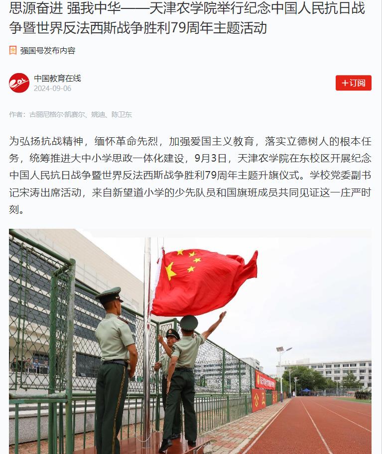 2024年9月6日,学习强国平台-天津学习平台报道taptap点点在东校区开展纪念中国人民抗日战争暨世界反法西斯战争胜利79周年主题升旗仪式。