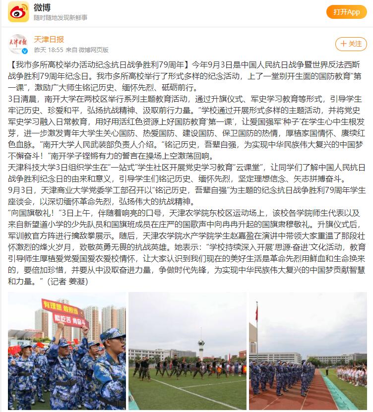 2024年9月3日,天津日报微博报道taptap点点举行中国人民抗日战争暨世界反法西斯战争胜利79周年纪念日活动,激励广大师生铭记历史、缅怀先烈、砥砺前行。