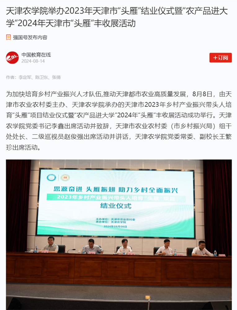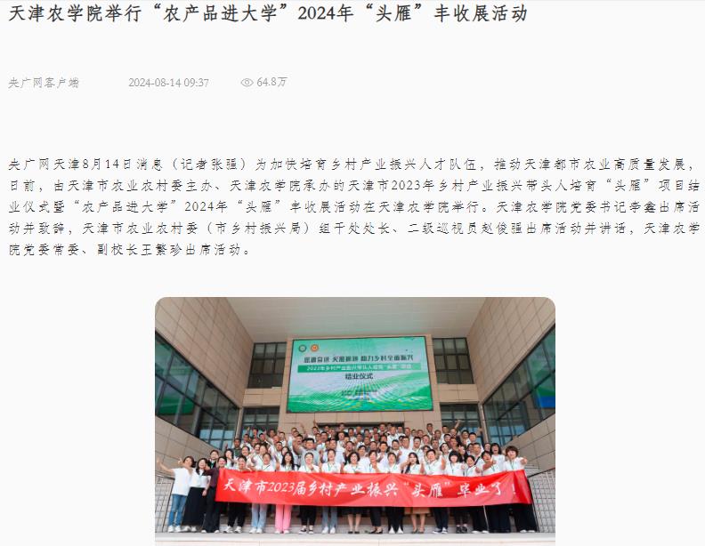 多家媒体报道天津市2023年乡村产业振兴带头人培育“头雁”项目结业仪式暨“农产品进大学”2024年“头雁”丰收展活动在taptap点点举行
