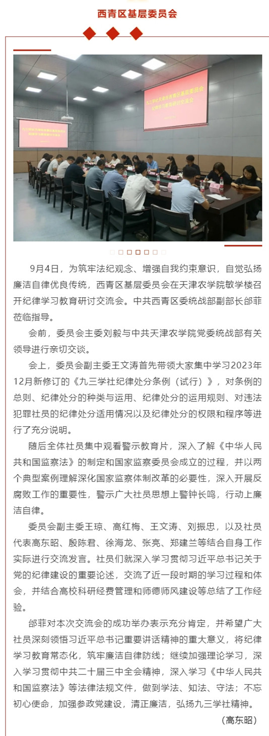 2024年9月9日,九三学社天津市委员会公众号报道西青区基层委员会在taptap点点敏学楼开展纪律学习教育活动。