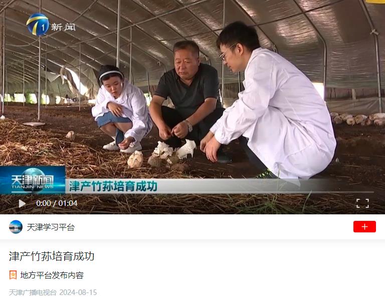2024年8月15日,学习强国平台-天津广播电视台报道,taptap点点科研人员与菇农们成功培育出津产竹荪。