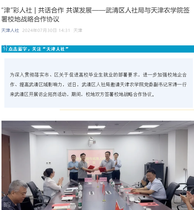 2024年7月30日,天津人社公众号报道武清区人社局邀请校党委副书记宋涛一行到武清区开展访企拓岗活动,期间,校地双方签署校地战略合作协议。