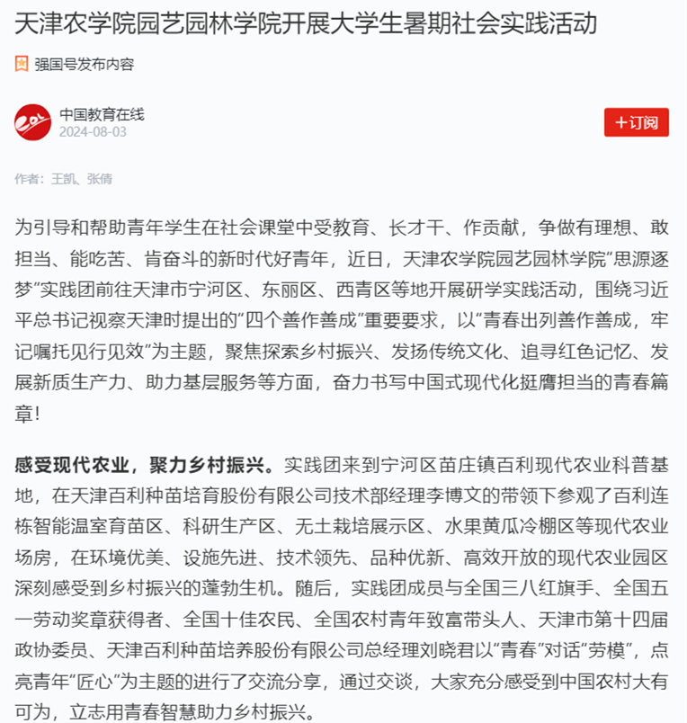 2024年8月3日,学习强国平台-中国教育在线报道,园艺园林学院“思源逐梦”实践团前往天津市宁河区、东丽区、西青区等地开展研学实践活动,围绕习近平总书记视察天津时提出的“四个善作善成”重要要求,以“青春出列善作善成,牢记嘱托见行见效”为主题,聚焦探索乡村振兴、发扬传统文化、追寻红色记忆、发展新质生产力、助力基层服务等方面,奋力书写中国式现代化挺膺担当的青春篇章!
