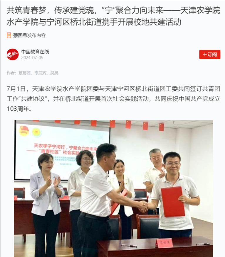 2024年7月5日,学习强国平台-中国教育在线报道taptap点点水产学院与宁河区桥北街道携手开展校地共建活动。