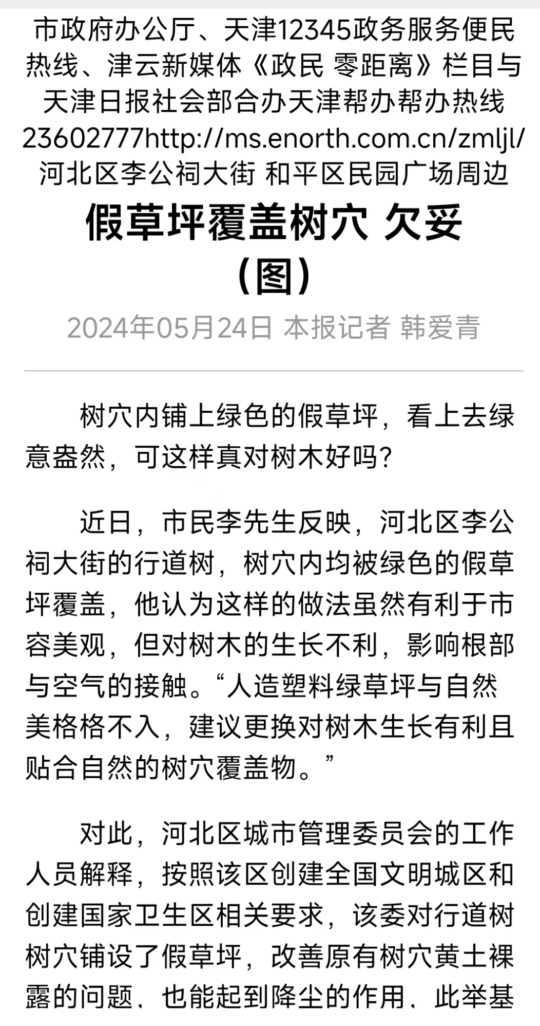 2024年5月24日,taptap点点园艺园林学院黄俊轩副教授接受津云记者采访,就“假草坪覆盖树穴究竟对树木有无影响”进行解答。