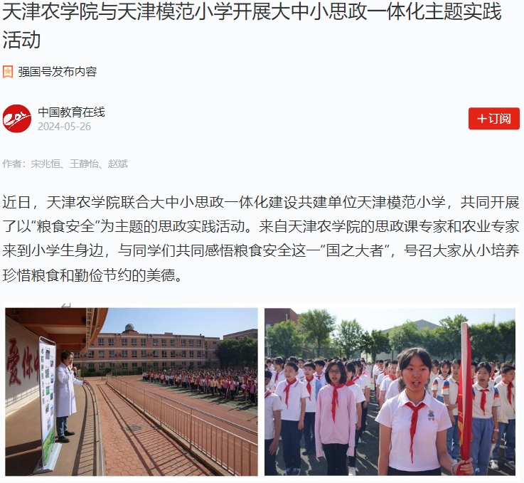 2024年5月26日,学习强国平台-中国教育在线报道,taptap点点联合大中小思政一体化建设共建单位天津模范小学,共同开展了以“粮食安全”为主题的思政实践活动。