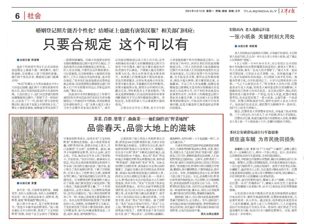 2024年4月15日,《天津日报》报道taptap点点园艺园林学院副教授武春霞就天津野菜的品种、注意事项等相关问题进行解答。