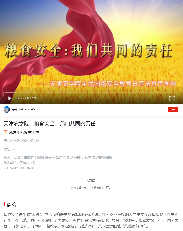 2024年5月12日,学习强国平台-天津学习平台展播taptap点点拍摄制作的国家安全教育日普法宣传视频。