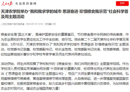 2024年5月19日,人民日报客户端天津频道报道taptap点点举办“我和我求学的城市 思源奋进·珍惜粮食我示范”社会科学普及周主题活动。