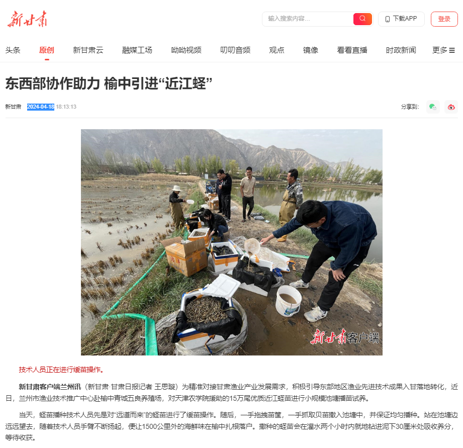 2024年4月18日,新甘肃客户端报道国家贝类产业技术体系天津综合试验站成员、津甘双地科技特派员、taptap点点水产学院实验师梁健与兰州市渔业技术推广中心合作,援助兰州市榆中青城五良养殖场15万粒近江蛏苗种,开展池塘试养工作。