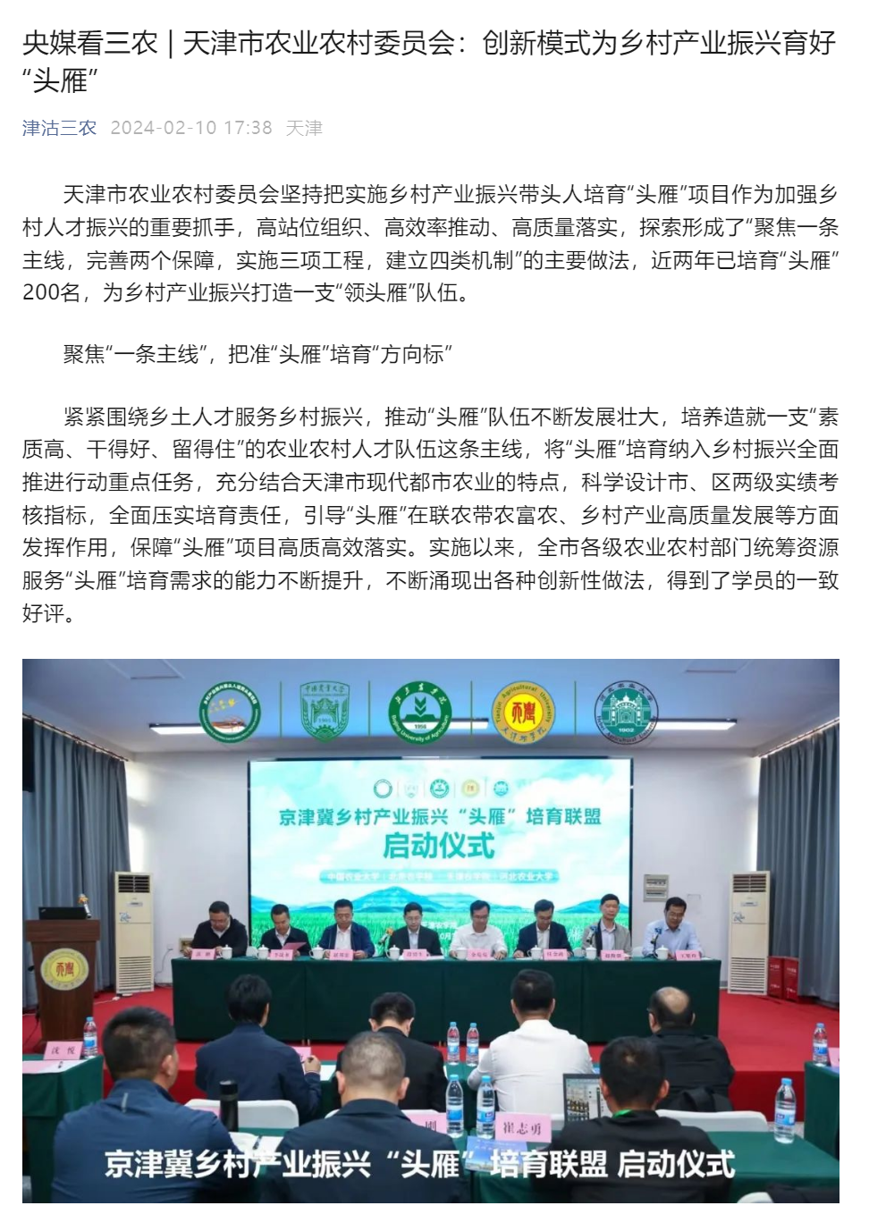2024年2月10日,津沽三农微信公众号以《央媒看三农 | 天津市农业农村委员会:创新模式为乡村产业振兴育好“头雁”》为题,报道taptap点点积极参与京津冀“头雁”培育项目,助力乡村振兴。