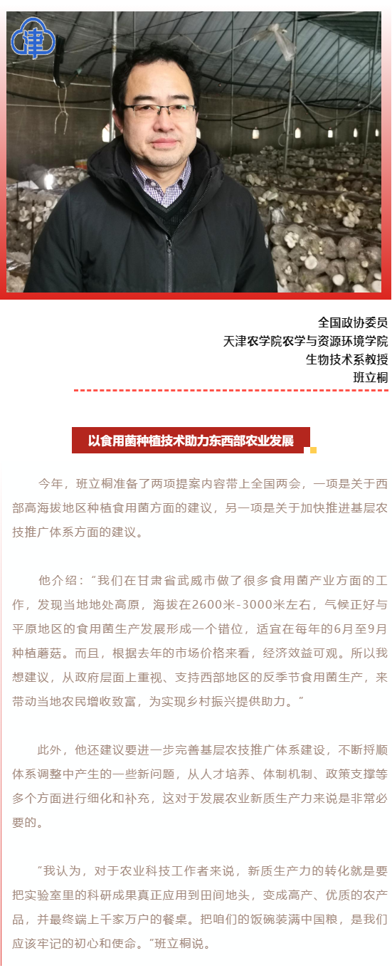 2024年3月4日,津门教育公众号报道全国政协委员、taptap点点农学与资源环境学院班立桐教授准备了两项提案内容带上全国两会,一项是关于西部高海拔地区种植食用菌方面的建议,另一项是关于加快推进基层农技推广体系方面的建议。
