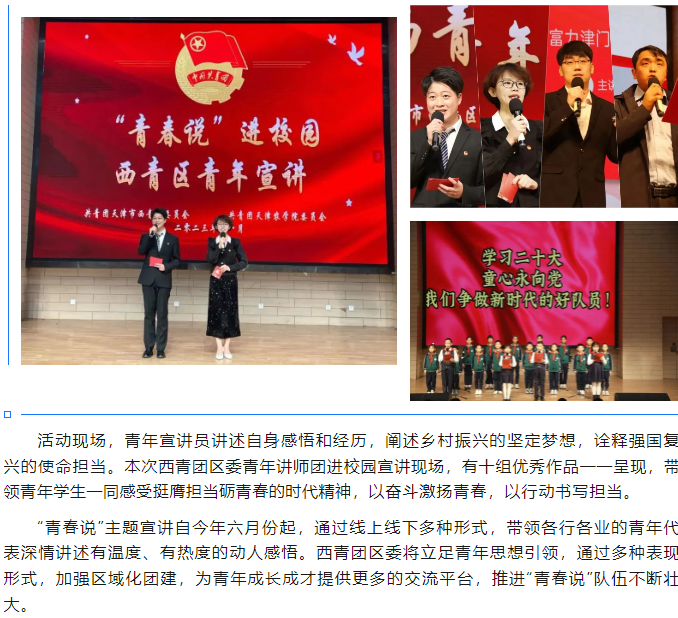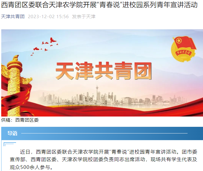 2023年12月2日,天津共青团报微信公众号报道西青团区委联合taptap点点开展“青春说”进校园青年宣讲活动。团市委宣传部、西青团区委、校团委负责同志出席活动,现场共有学生代表及观众500余人参与。