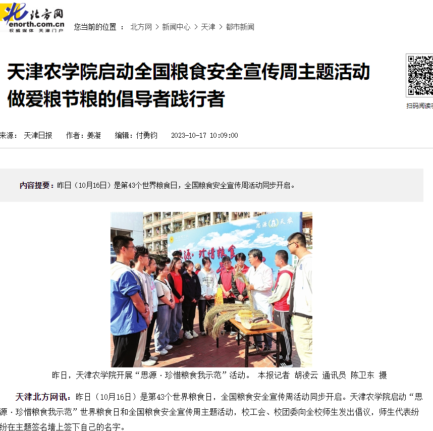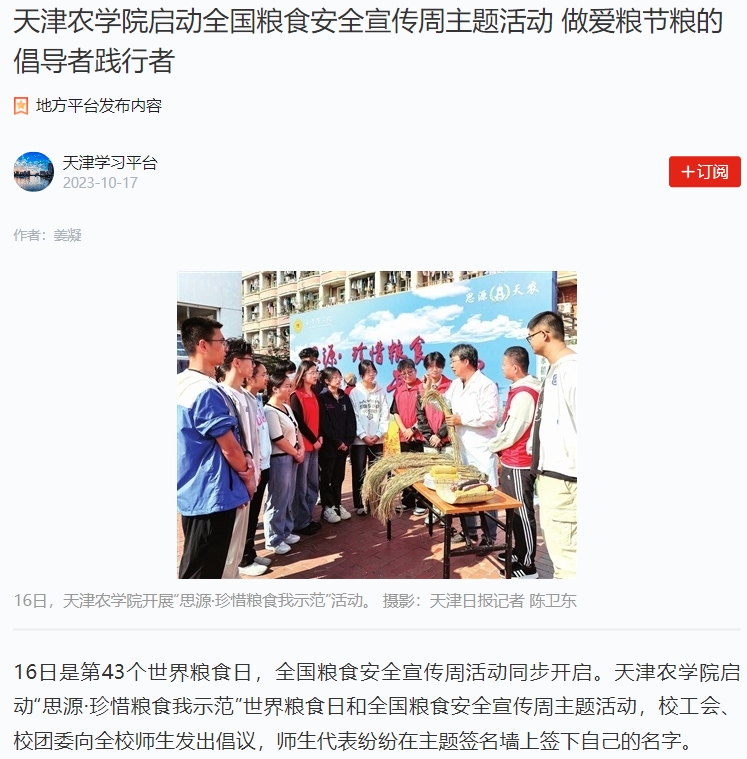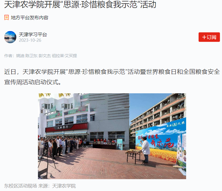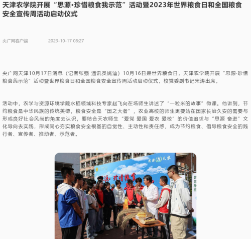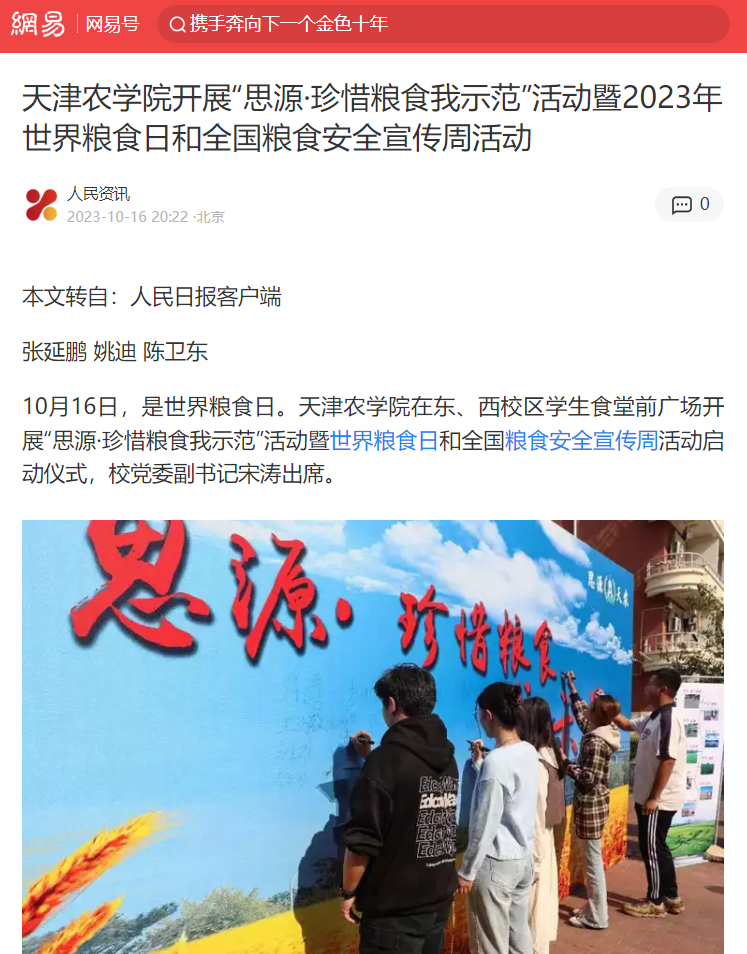 2023年10月16日-17日,人民日报、央广网、天津日报、天津教育报、北方网、学习强国平台等多家媒体报道taptap点点开展“思源·珍惜粮食我示范”活动暨2023年世界粮食日和全国粮食安全宣传周活动启动仪式。