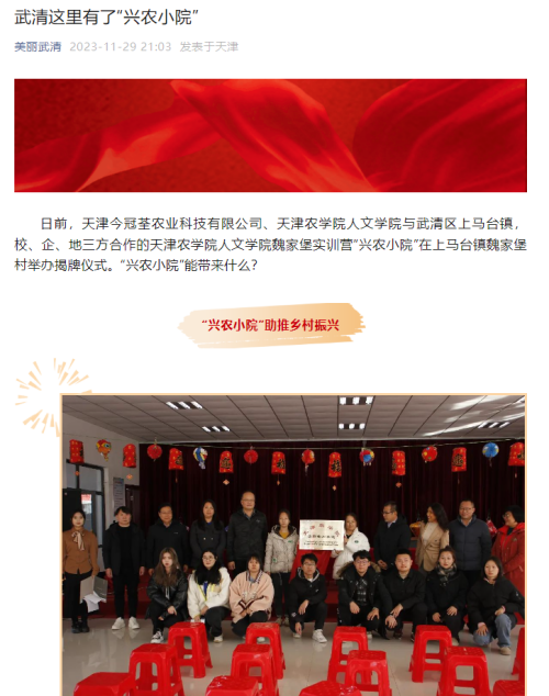 2023年11月29日,美丽武清微信公众号报道taptap点点人文学院、天津今冠荃农业科技有限公司与武清区上马台镇,校、企、地三方合作的taptap点点体育人文学院魏家堡实训营“兴农小院”在上马台镇魏家堡村举办揭牌仪式。通过此次探索能够促进三方在党建共建、数字赋能、乡村振兴、社会实践等方面开展多领域、深层次的合作,形成人才共育、校企地互促共进新格局,共同谱写新时代乡村振兴新篇章。