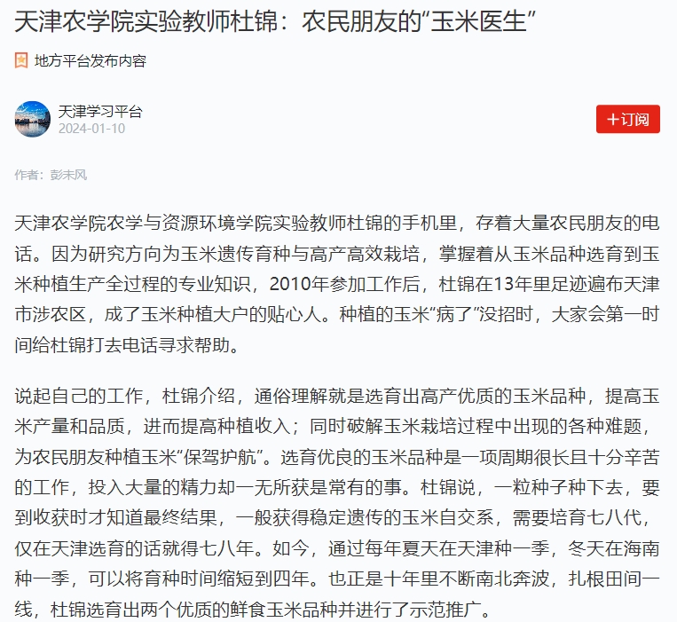 2024年1月10日,学习强国平台-天津学习平台报道taptap点点农学与资源环境学院杜锦老师的科技帮扶事迹。