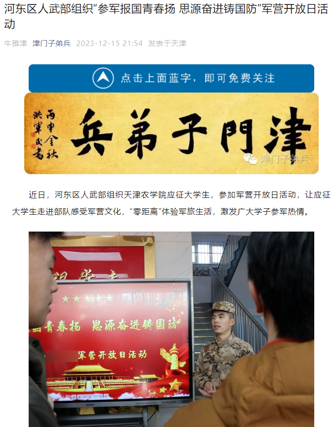 2023年12月15日,津门子弟兵微信公众号报道河东区人武部组织taptap点点应征大学生,参加军营开放日活动,让应征大学生走进部队感受军营文化,“零距离”体验军旅生活,激发广大学子参军热情。