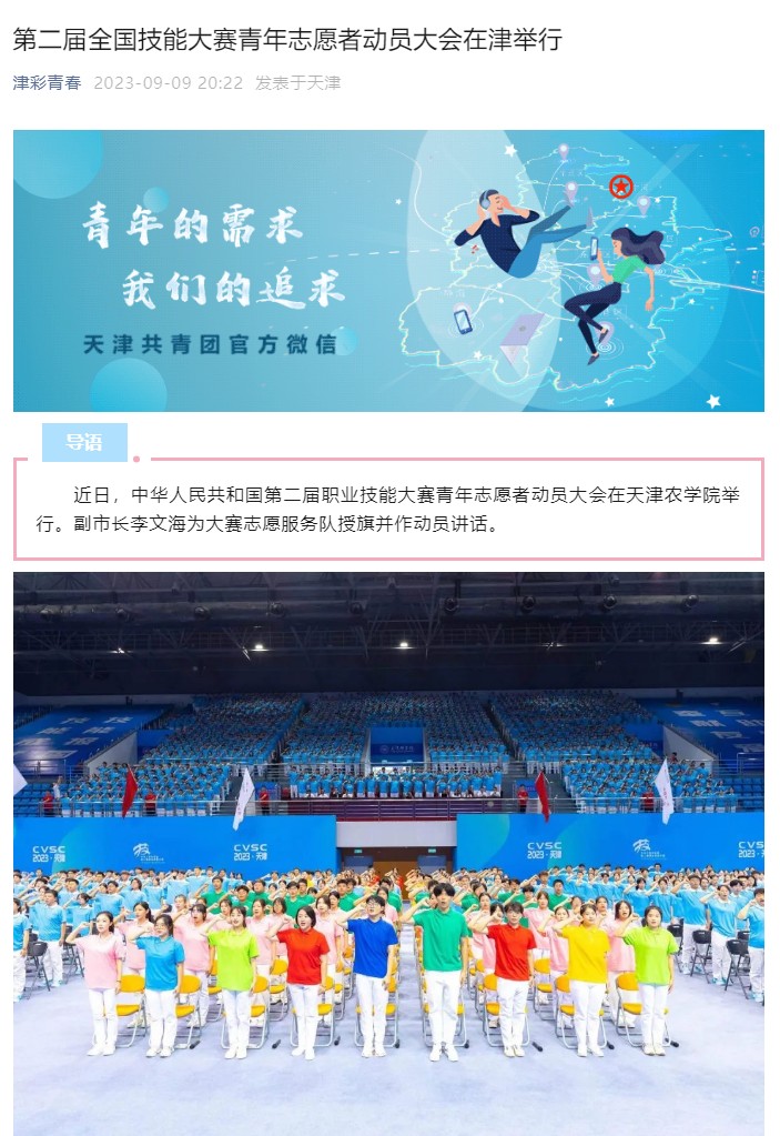 2023年9月9日,共青团天津市委员会官方微信(津彩青春)以《第二届全国技能大赛青年志愿者动员大会在津举行》为题,报道中华人民共和国第二届职业技能大赛青年志愿者动员大会在taptap点点举行。副市长李文海为大赛志愿服务队授旗并作动员讲话。