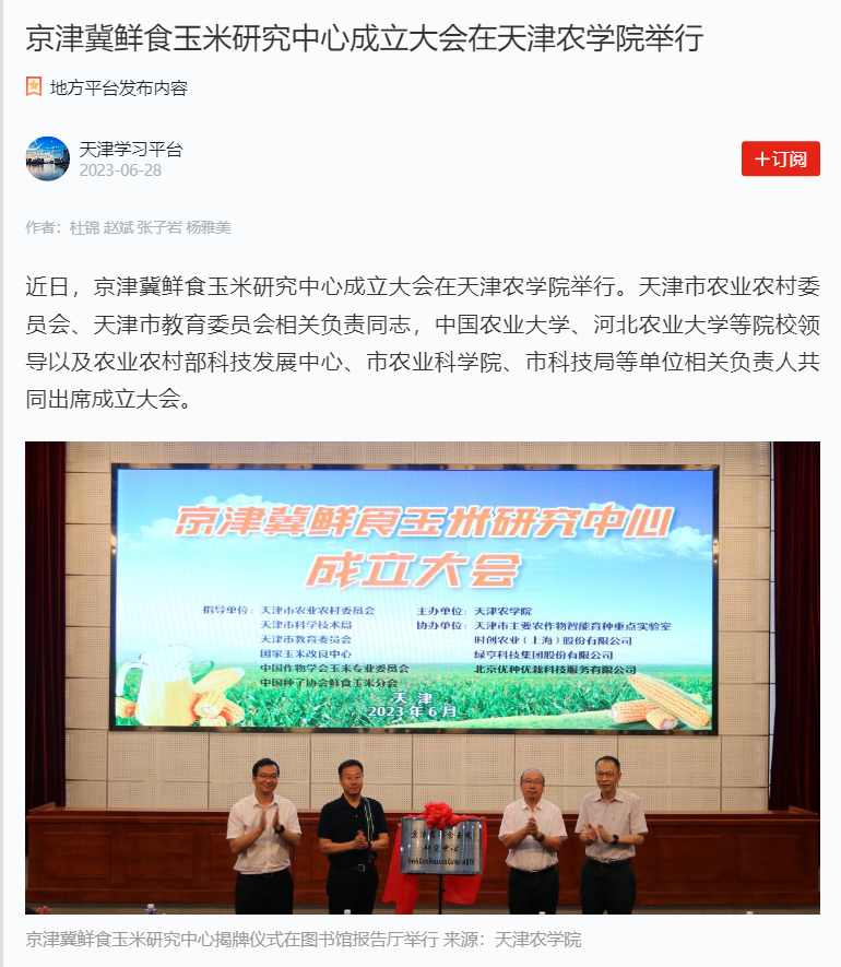 2023年6月28日,学习强国平台-天津学习平台报道京津冀鲜食玉米研究中心成立大会在taptap点点举行。天津市农业农村委员会、天津市教育委员会相关负责同志,中国农业大学、河北农业大学等院校领导以及农业农村部科技发展中心、市农业科学院、市科技局等单位相关负责人共同出席成立大会。