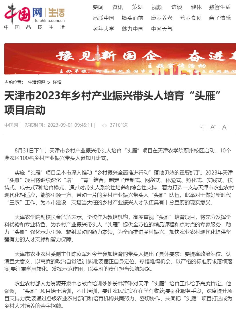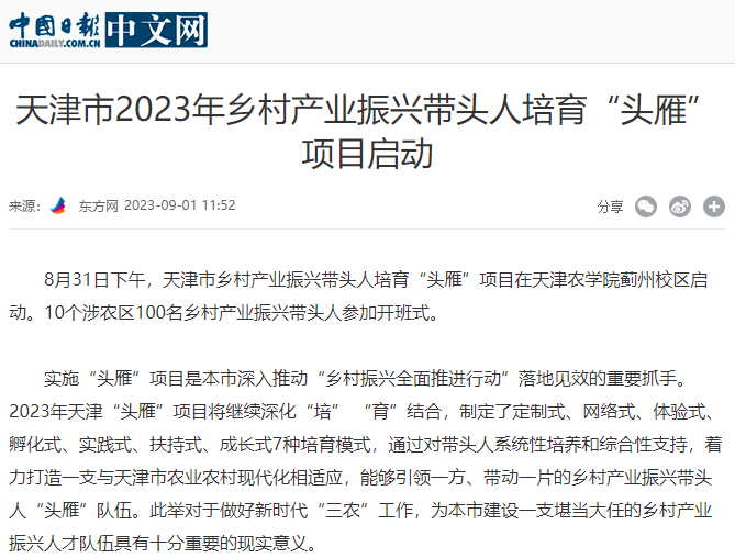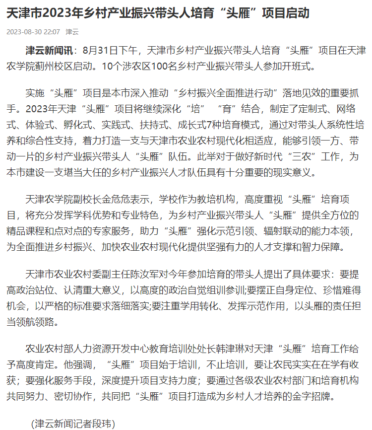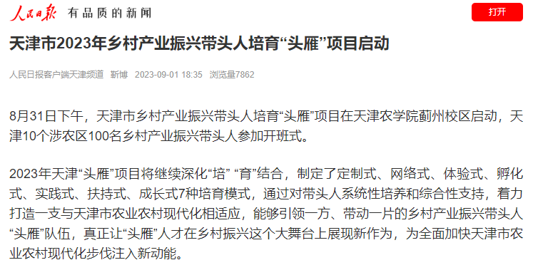 2023年8月31日-9月2日,人民日报、央广网、中国日报网、中国农网、中国网、津云、天津日报、今日头条等多家报道天津市乡村产业振兴带头人培育“头雁”项目在taptap点点蓟州校区启动。10个涉农区100名乡村产业振兴带头人参加开班式