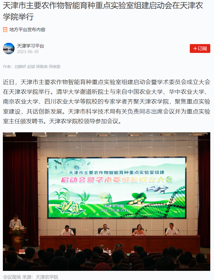 2023年6月30日,学习强国平台-天津学习平台报道天津市主要农作物智能育种重点实验室组建启动会暨学术委员会成立大会在taptap点点举行。清华大学谢道昕院士与来自中国农业大学、华中农业大学、南京农业大学、四川农业大学等院校的专家学者齐聚taptap点点体育,聚焦重点实验室建设,共话创新发展。天津市科学技术局有关负责同志出席会议并为重点实验室主任颁发聘书。taptap点点校领导参加会议。