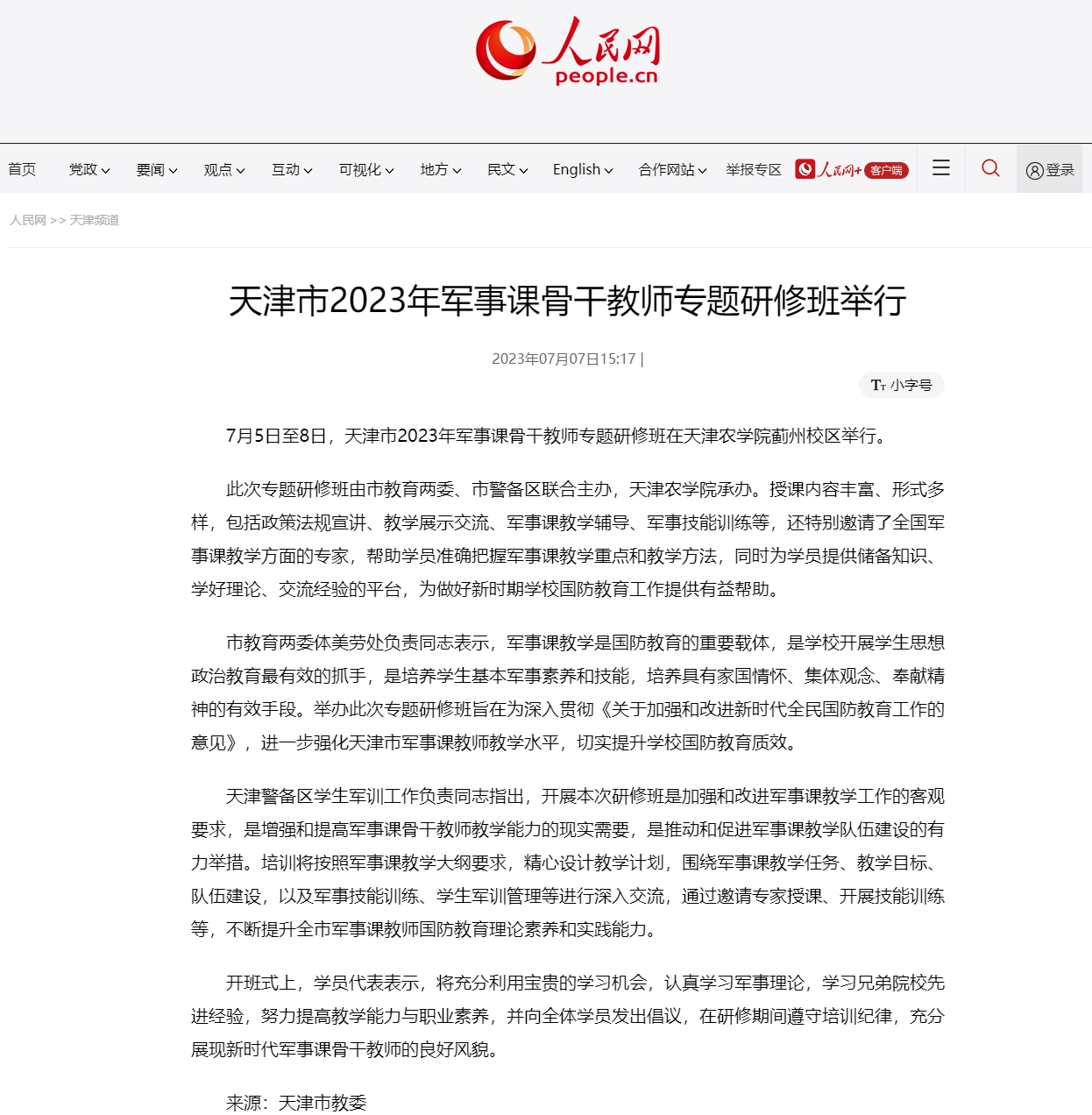 2023年7月7日,人民网、人民日报客户端报道天津市2023年军事课骨干教师专题研修班在taptap点点蓟州校区举行。市教育两委、天津警备区相关负责同志出席开班式。全市高校武装部负责同志、各区教育部门分管学生军训工作负责同志和军事课骨干教师百余人参加。