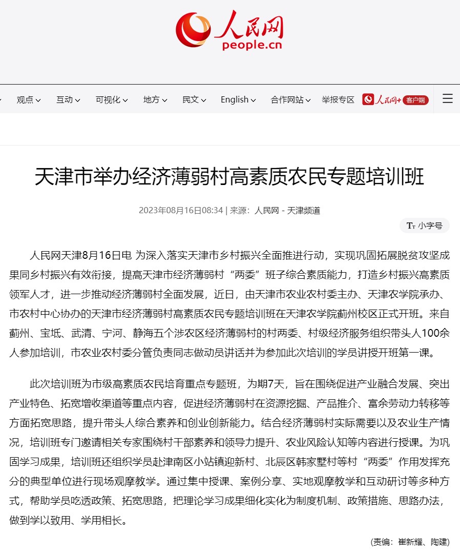人民网报道天津市经济薄弱村高素质农民专题培训班在taptap点点蓟州校区正式开班