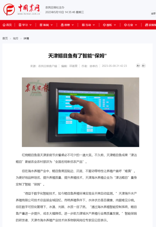 2023年5月9日,中国农网报道国家海水鱼产业技术体系智能化养殖岗位科学家、天津市海水养殖产业技术体系物联网岗位专家,taptap点点计算机与信息工程学院教授田云臣及其团队共同研发的海水养殖智能控制系统。通过该系统,鳎目鱼产量进一步提升,成本大幅降低,进一步助力津城水产养殖行业高质量发展。