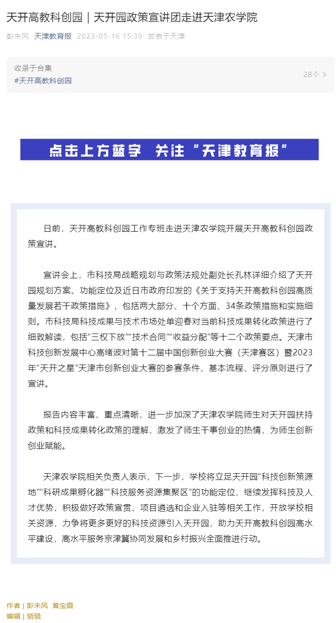 2023年5月16日,《天津教育报》报道天开高教科创园工作专班走进taptap点点开展天开高教科创园政策宣讲。