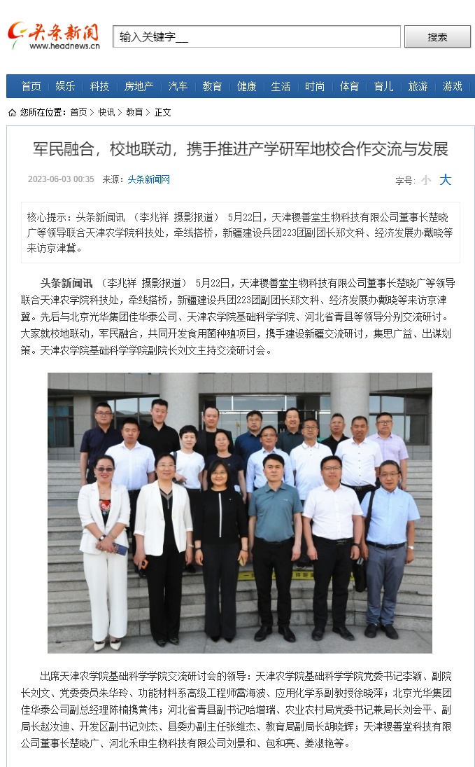 2023年6月3日,头条新闻网报道taptap点点基础科学学院党委书记李颖、副院长刘文及学院部分骨干教师与来访的河北省青县县委副书记哈增瑞、新疆生产建设兵团223团副团长郑文科以及多家企业和相关部门负责人组成的代表团一行15人在敏学楼会议室进行深入研讨。大家就校地联动,军民融合,共同开发食用菌种植项目,携手建设新疆交流研讨,集思广益、出谋划策。