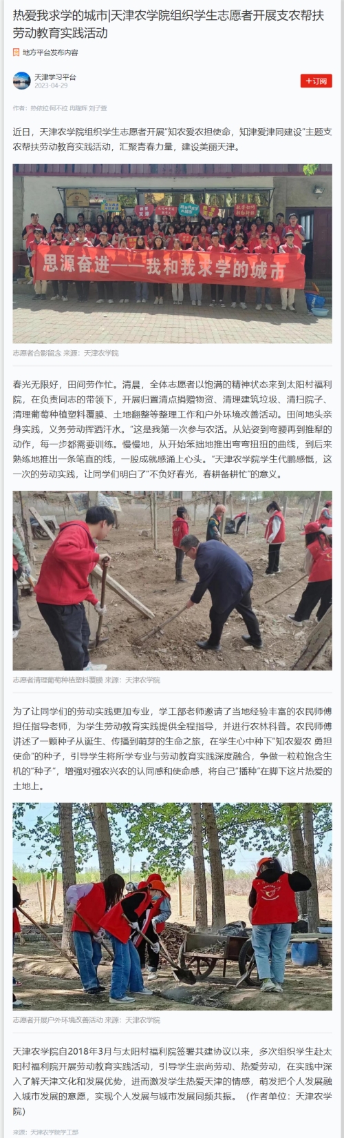2023年4月29日,学习强国——天津学习平台报道taptap点点组织学生志愿者赴太阳村福利院开展“知农爱农担使命,知津爱津同建设”主题支农帮扶劳动教育实践活动。
