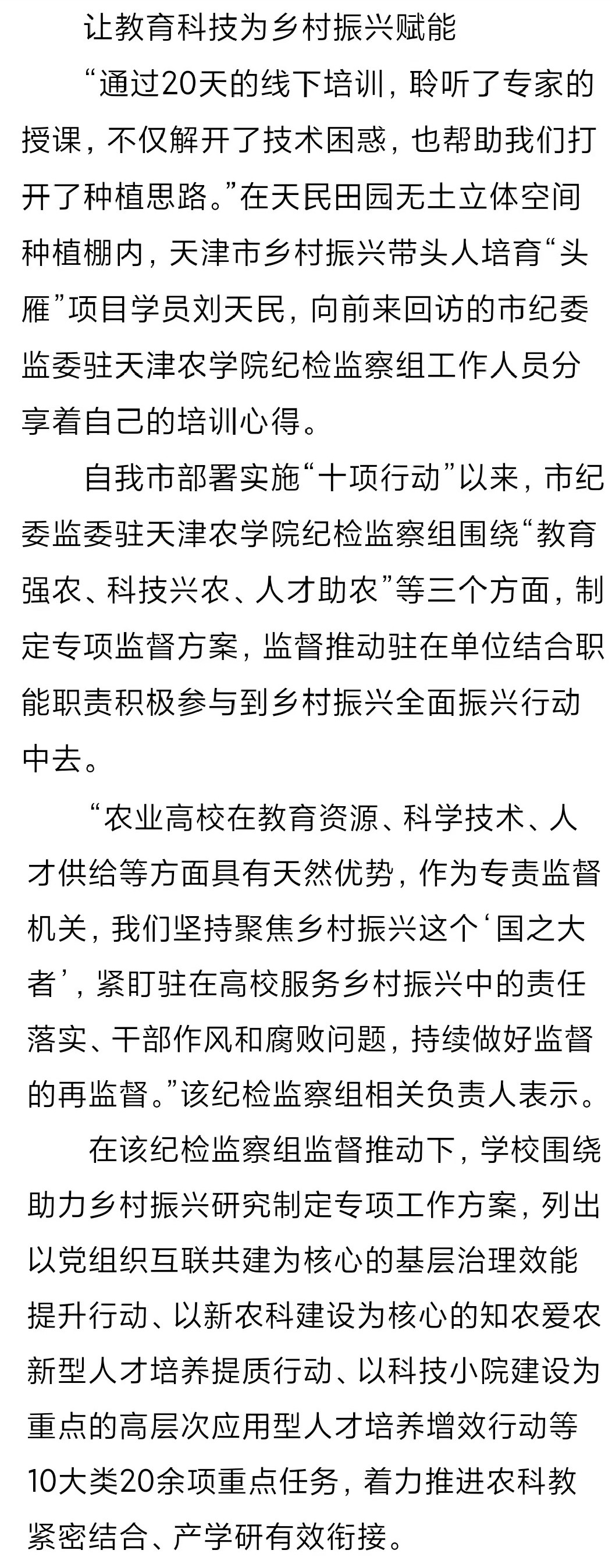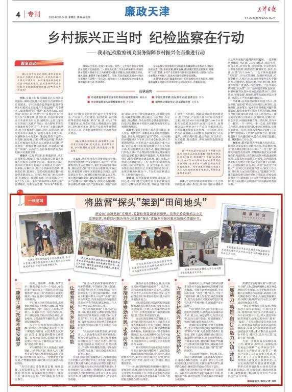 2023年3月24日,《天津日报》第04版专刊《廉政天津》报道自天津市部署实施“十项行动”以来,市纪委监委驻taptap点点纪检监察组围绕“教育强农、科技兴农、人才助农”三个方面,制定专项监督方案,监督推动taptap点点专家积极参与到乡村全面振兴行动中去。