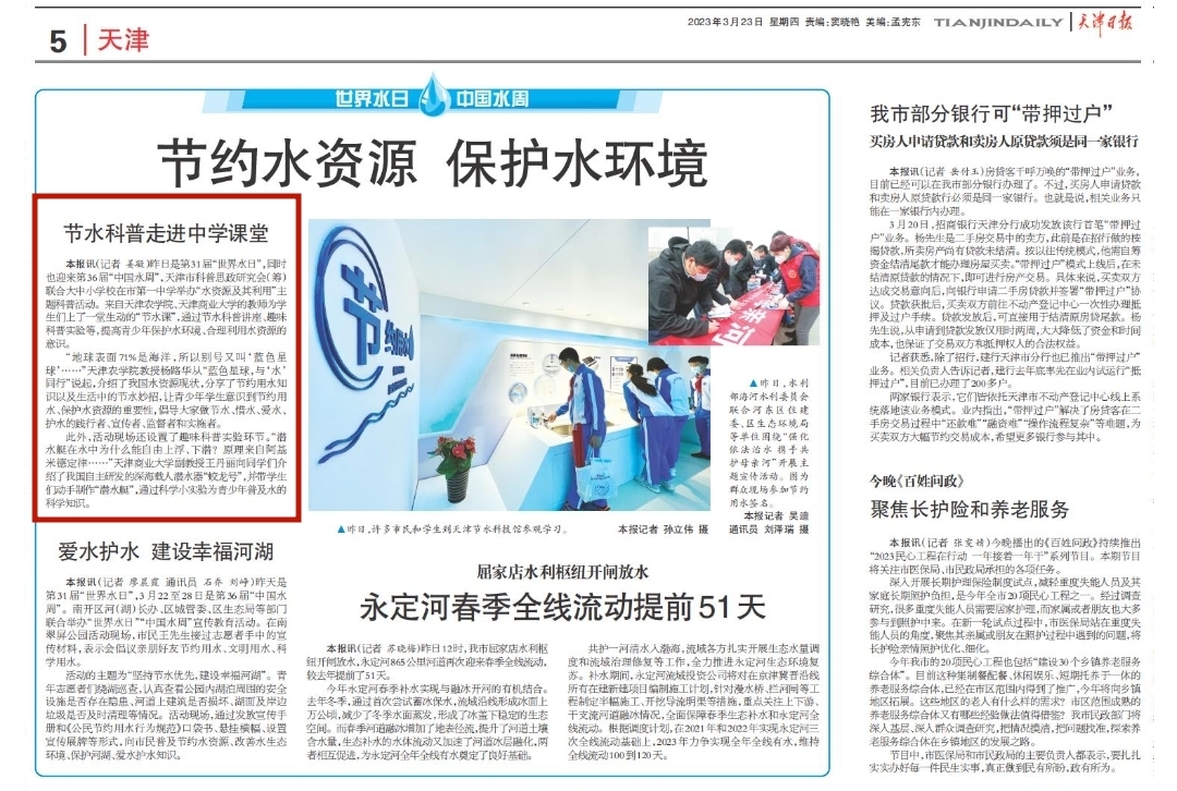 2023年3月23日,《天津日报》报道taptap点点水利工程学院杨路华教授走进中学课堂,进行节水科普。