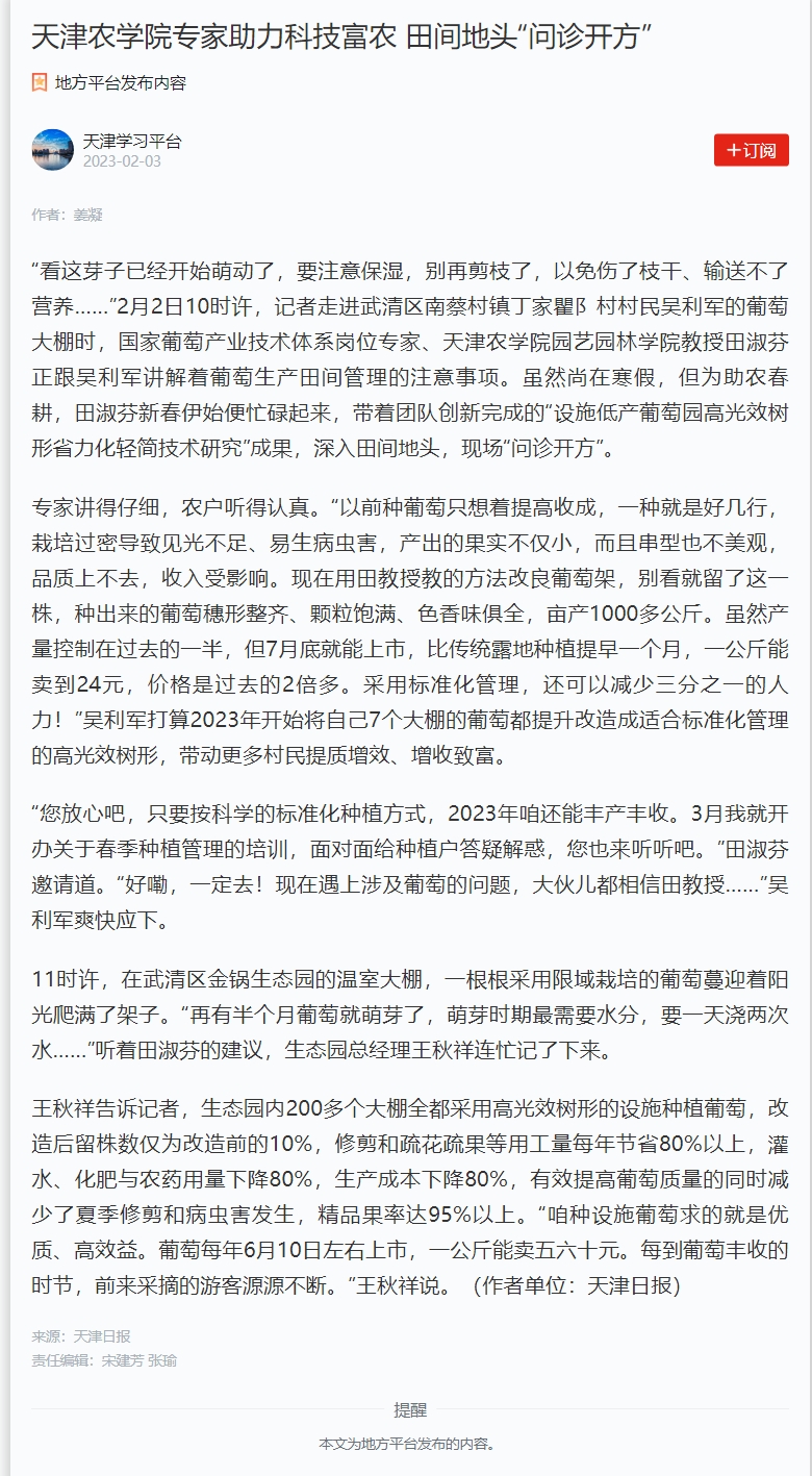 2023年2月3日学习强国平台以《taptap点点体育专家助力科技富农 田间地头“问诊开方”》为题,报道了taptap点点园艺园林学院田淑芬研究员新春走基层 ,助力科技富农的事迹。
