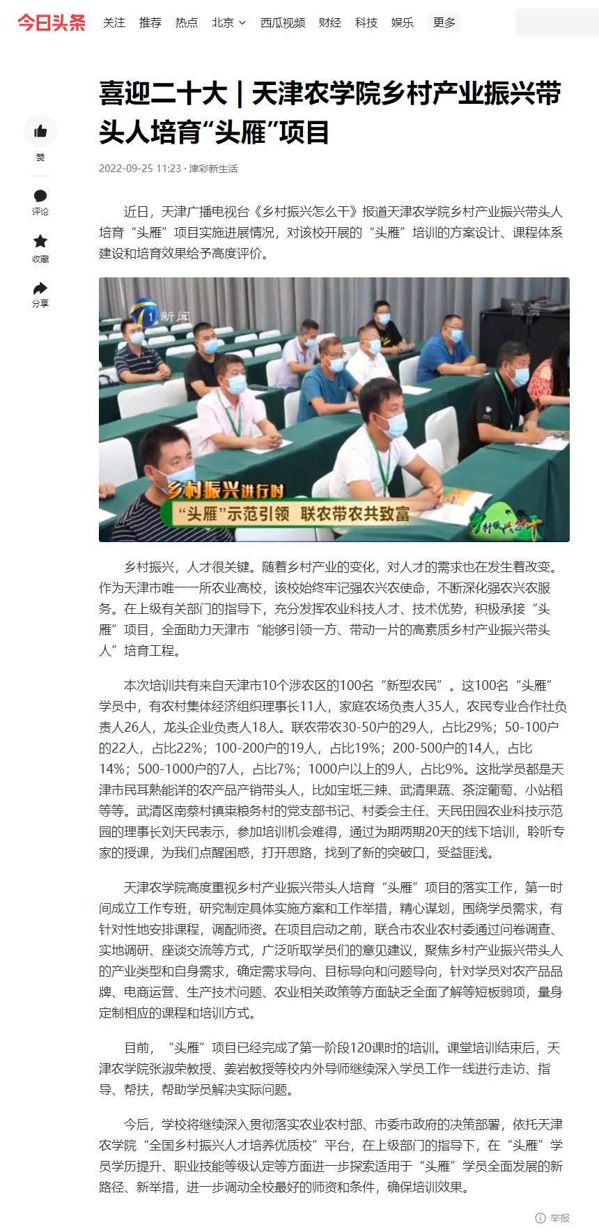 乡村振兴,人才很关键。随着乡村产业的变化,对人才的需求也在发生着改变。作为天津市唯一一所农业高校,该校始终牢记强农兴农使命,不断深化强农兴农服务。在上级有关部门的指导下,充分发挥农业科技人才、技术优势,积极承接“头雁”项目,全面助力天津市“能够引领一方、带动一片的高素质乡村产业振兴带头人”培育工程。
