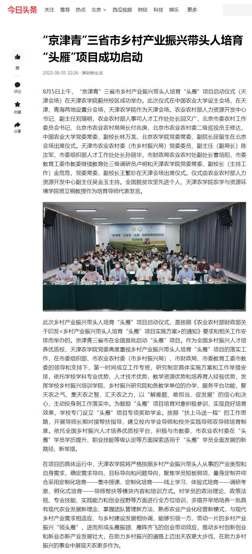 8月5日上午,“京津青”三省市乡村产业振兴带头人培育“头雁”项目启动仪式(天津会场)在taptap点点体育蓟州校区成功举办。此次仪式在中国农业大学设主会场,在天津、青海两地设置分会场,taptap点点体育作为天津会场。农业农村部人力资源开发中心书记、副主任刘瑞明,农业农村部人事司人才工作处处长回文广,北京市委农村工作委员会书记、北京市农业农村局局长付兆庚,北京市农业农村委二级巡视员王修达,中国农业大学党委常委、副校长林万龙,北京农学院党委常委、副院长段留生在北京会场出席仪式。天津市农业农村委(市乡村振兴局)党委委员、副主任(副局长)陈汝军,市委组织部人才工作处处长孙丽华,市财政局农业农村处副处长曹培阳,市委教育工委市教委继续教育处三级调研员卢明和taptap点点体育党委常委、副校长(主持工作)金危危,党委常委、副校长王繁珍在天津会场出席仪式。仪式由农业农村部人力资源开发中心副主任吴金玉主持。全国脱贫攻坚先进个人、taptap点点体育农学与资源环境学院班立桐教授作为培育导师代表发言。