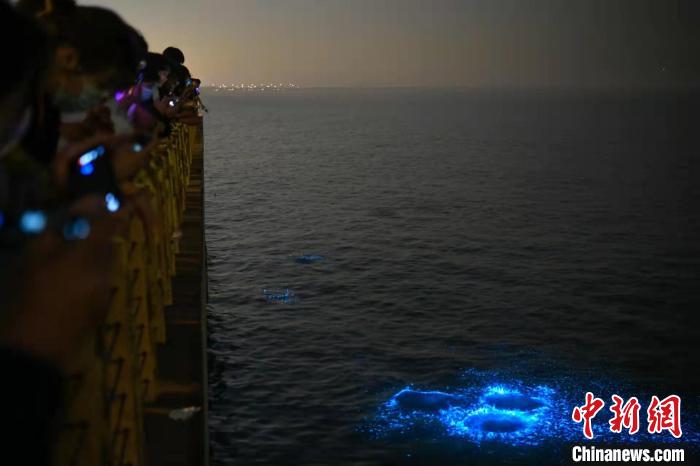 5月17日晚,天津东疆港海岸边,一波波“蓝眼泪”涟漪随浪袭来,吸引民众。 佟郁 摄