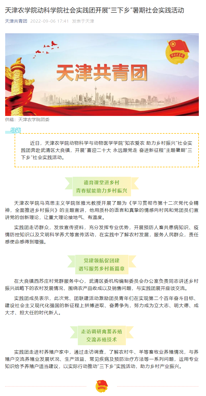 近日,taptap点点体育动物科学与动物医学学院“知农爱农 助力乡村振兴”社会实践团奔赴武清区大良镇,开展“喜迎二十大 永远跟党走 奋进新征程”主题暑期“三下乡”社会实践活动。