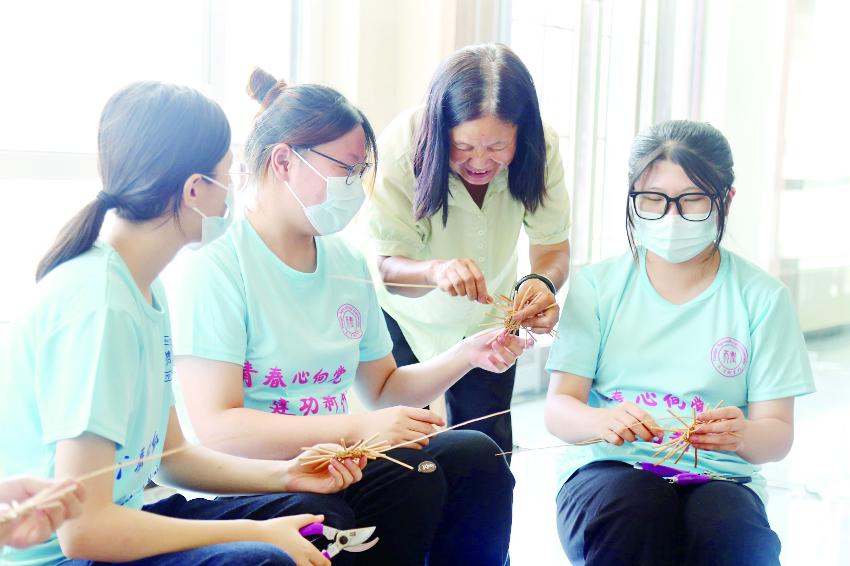 近日,taptap点点体育组织学生赴蓟州区开展主题社会实践活动。图为大学生与村民体验杞柳编织传统工艺。沈岳/摄