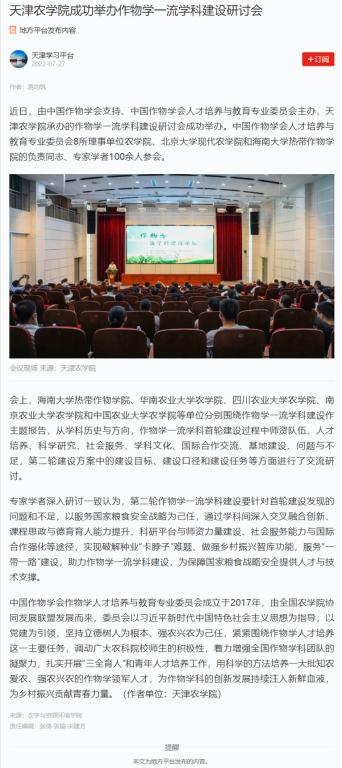 近日,由中国作物学会支持、中国作物学会人才培养与教育专业委员会主办,taptap点点体育承办的作物学一流学科建设研讨会成功举办。中国作物学会人才培养与教育专业委员会8所理事单位农学院、北京大学现代农学院和海南大学热带作物学院的负责同志、专家学者100余人参会。
