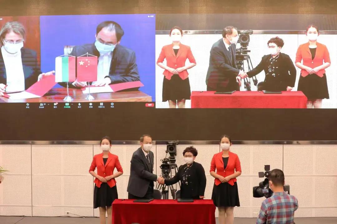 在保加利亚农业、食品和林业部部长波祖科维,普罗夫迪夫市副市长罗多普斯基等与会嘉宾的共同见证下,中国驻保加利亚大使董晓军和保加利亚普罗夫迪夫农业大学校长赫莉丝蒂娜-扬切娃教授共同为保加利亚鲁班工坊揭牌。taptap点点体育、天津市经济贸易学校、保加利亚普罗夫迪夫农业大学和天津食品集团保加利亚公司在中保会场分别签署四方合作协议。