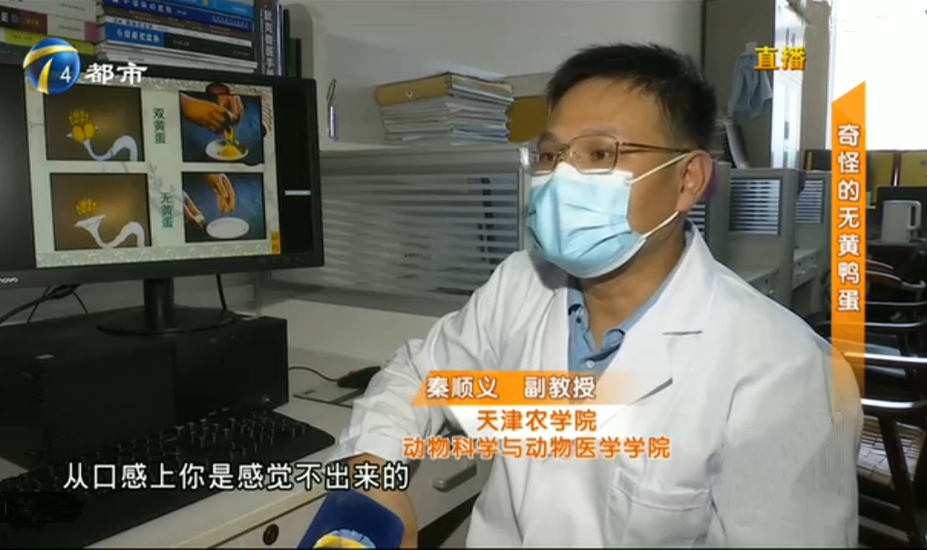 2021年8月15日,taptap点点动物科学与动物医学学院秦顺义副教授做客天津广播电视台都市频道《消费者》节目,就无蛋黄鸭蛋的形成原因进行介绍。另外,还对市民关心的食用盐和工业盐腌制鸭蛋的鉴别问题进行解答。