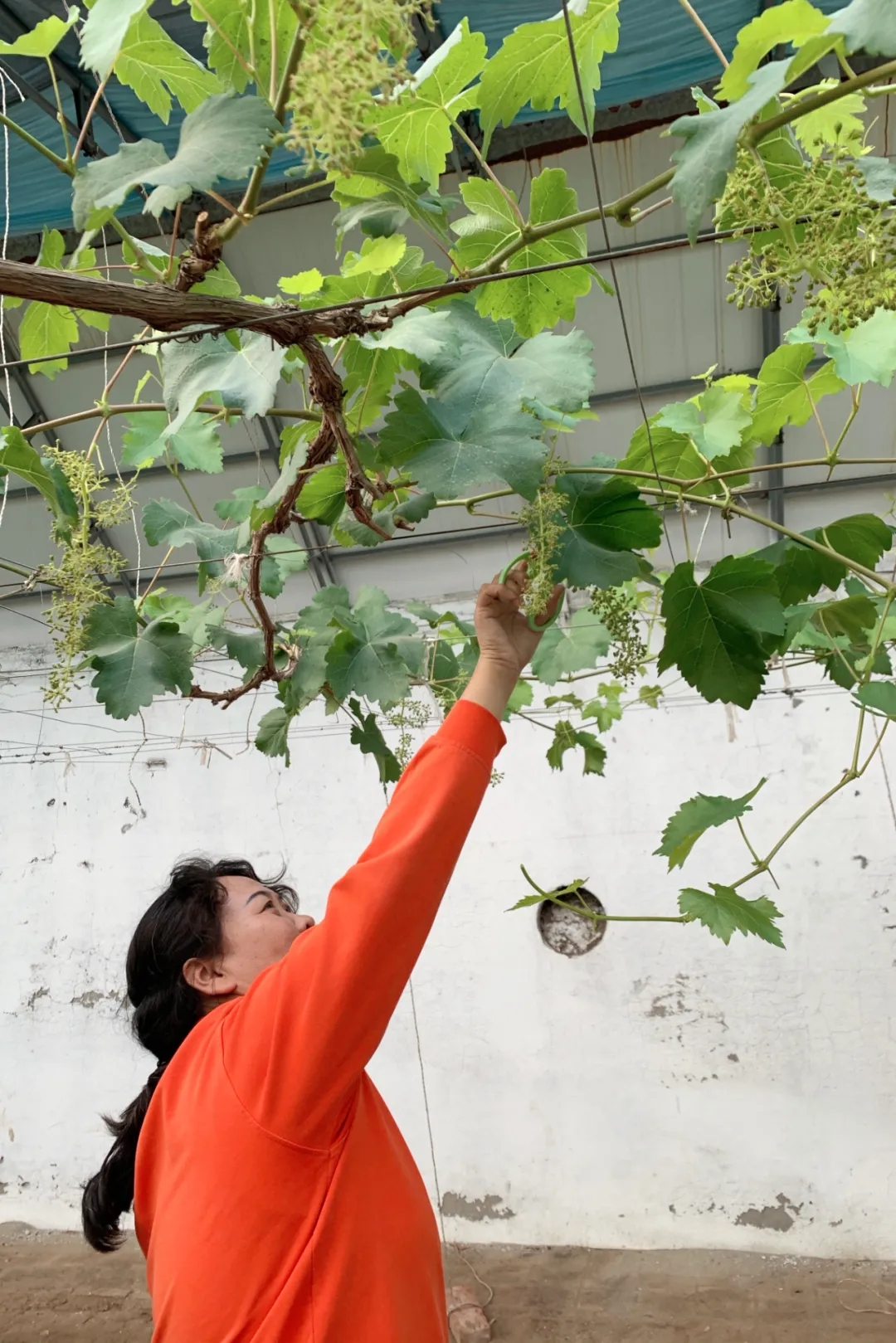 在曙春蔬果专业合作社的葡萄棚里剪穗的田淑芬。刘茜/摄