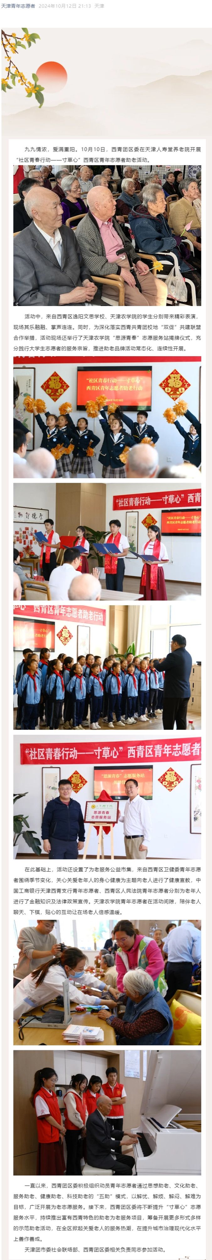2024年10月12日,天津青年志愿者公众号、学习强国平台、天津西青公众号、西青融媒公众号等多家媒体报道taptap点点师生参与“社区青春行动——寸草心”西青区青年志愿者助老活动。