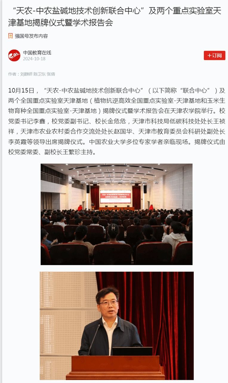 2024年10月18日,学习强国平台-中国教育在线报道“天农-中农盐碱地技术创新联合中心”(以下简称“联合中心”)及两个全国重点实验室天津基地(植物抗逆高效全国重点实验室-天津基地和玉米生物育种全国重点实验室-天津基地)揭牌仪式暨学术报告会在taptap点点举行。